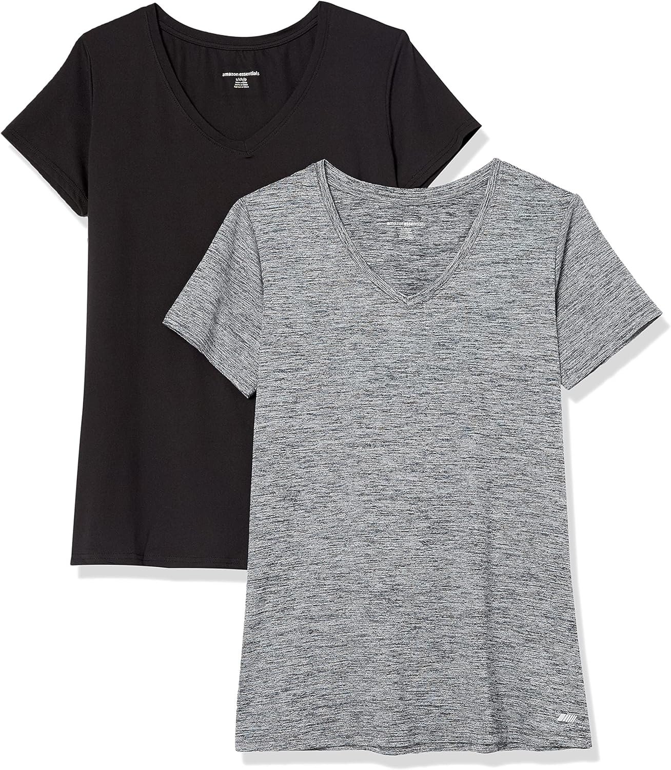 Amazon Essentials Women’s Active Quick Dry Tech Stretch Short-Sleeve V-Neck T-Shirt (Available in Plus Size), Pack of 2