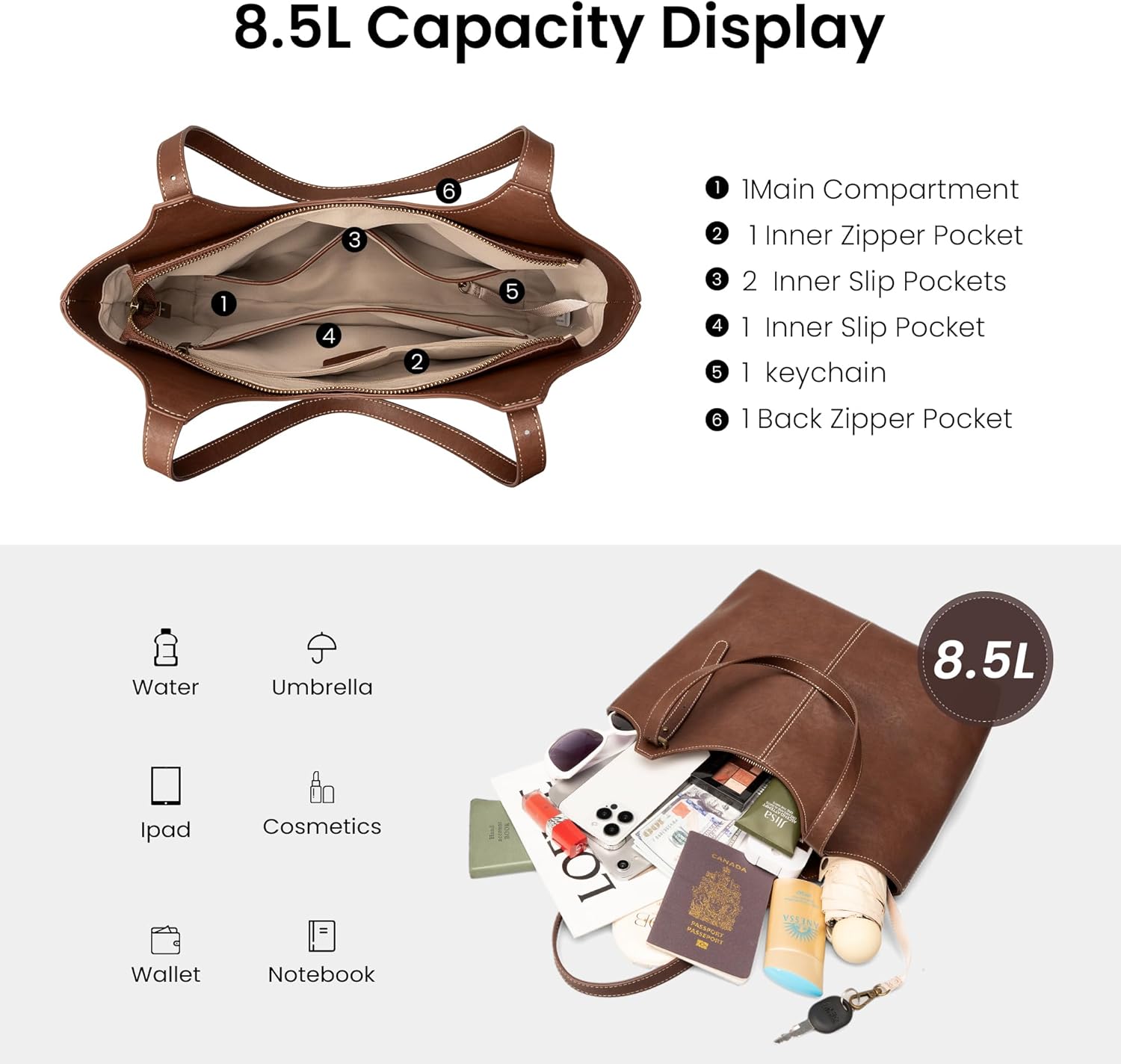 I love this rich looking brown tote! The leather is gorgeous and somehow resists any scratches. There is a cream colored top stiching which makes it not just a plain tote but more high end. The large outside zip pocket is a must for a phone. Inside the lining is a light color making things easy to find. The inside is the most thoughtfully designed of any purse I’ve owned. A strap with hook to put a Keychain on so easy retrieval. There is a large zipper pouch on one side as well as a large slip pocket. Two more slip pockets on the other side. The interior is large enough for a tablet, water bottle, sunglasses, no problem. Lastly and most important these days is the tremendous price for all this quality!