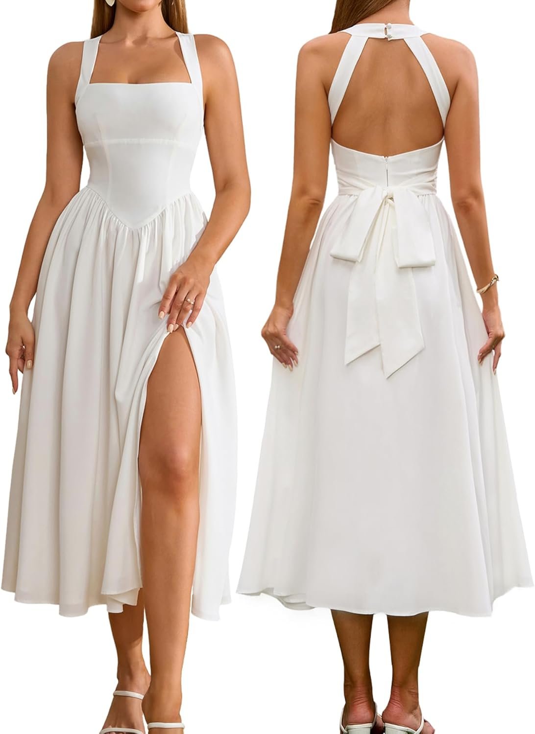 Floral Midi Corset Dress Wedding Guest Flowy Slit Lace Up Dresses for Women Tea Party A Line Casual Sundress