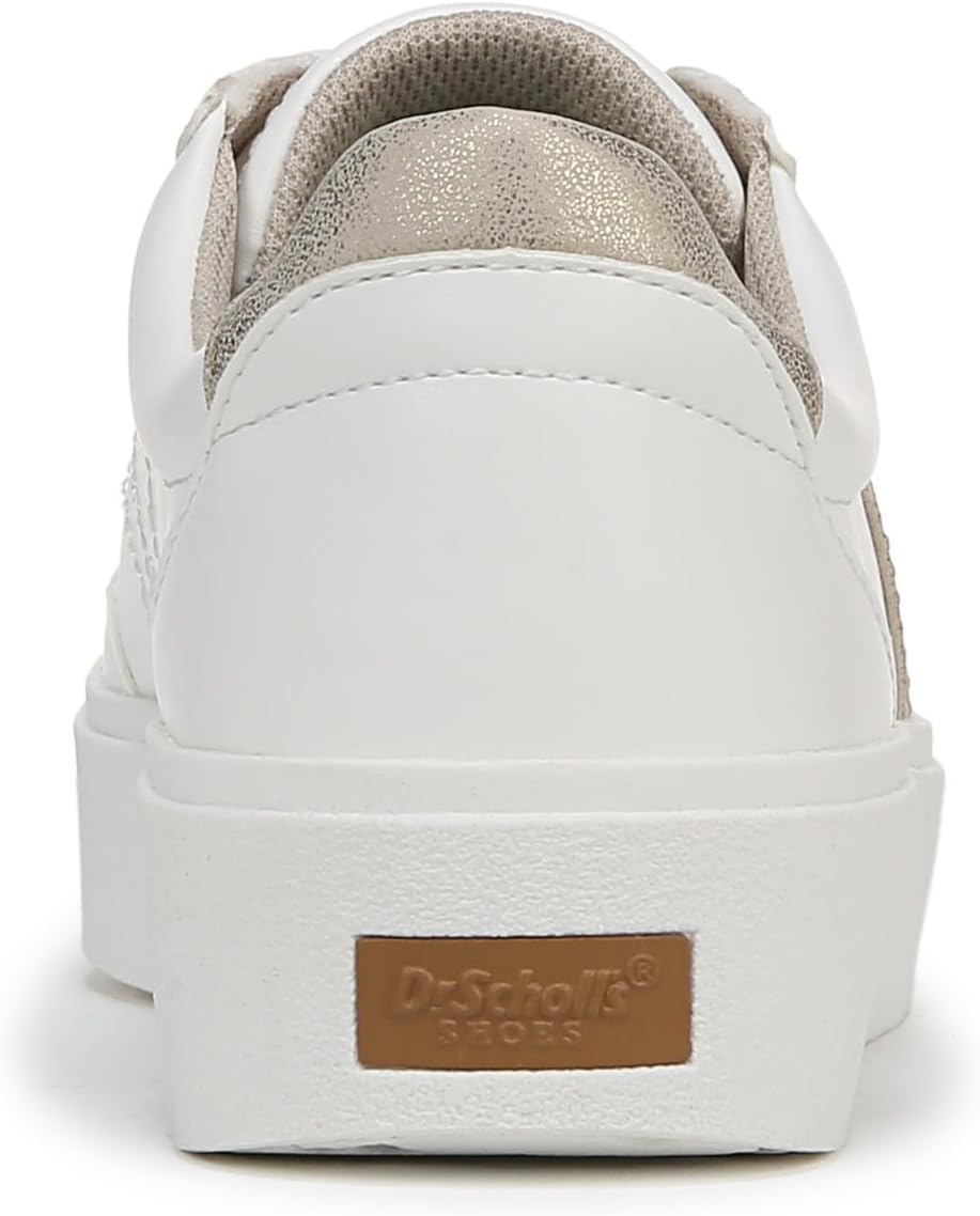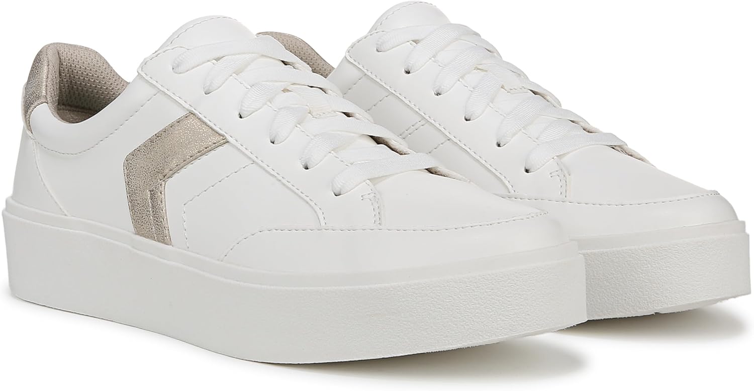 Bought these sneakers last-minute before a Europe trip. I wore them almost every day for 2 weeks, both with and without socks. They were super comfy, zero break-in period and no blisters. They’re supportive with some lift without being heavy. They looked cute with wide-leg pants and also a slimmer cut, and I loved that they came with a pair of white laces too. These fit true to size to non-athletic shoes — I’m usually a 6.5/7 and ordered the 7. My only complaint is that the tan Dr. Scholls logo rectangle at the back of the heel started peeling off on one of the shoes after about a week. I just peeled them both off to match. Highly recommend these and will likely buy them again!