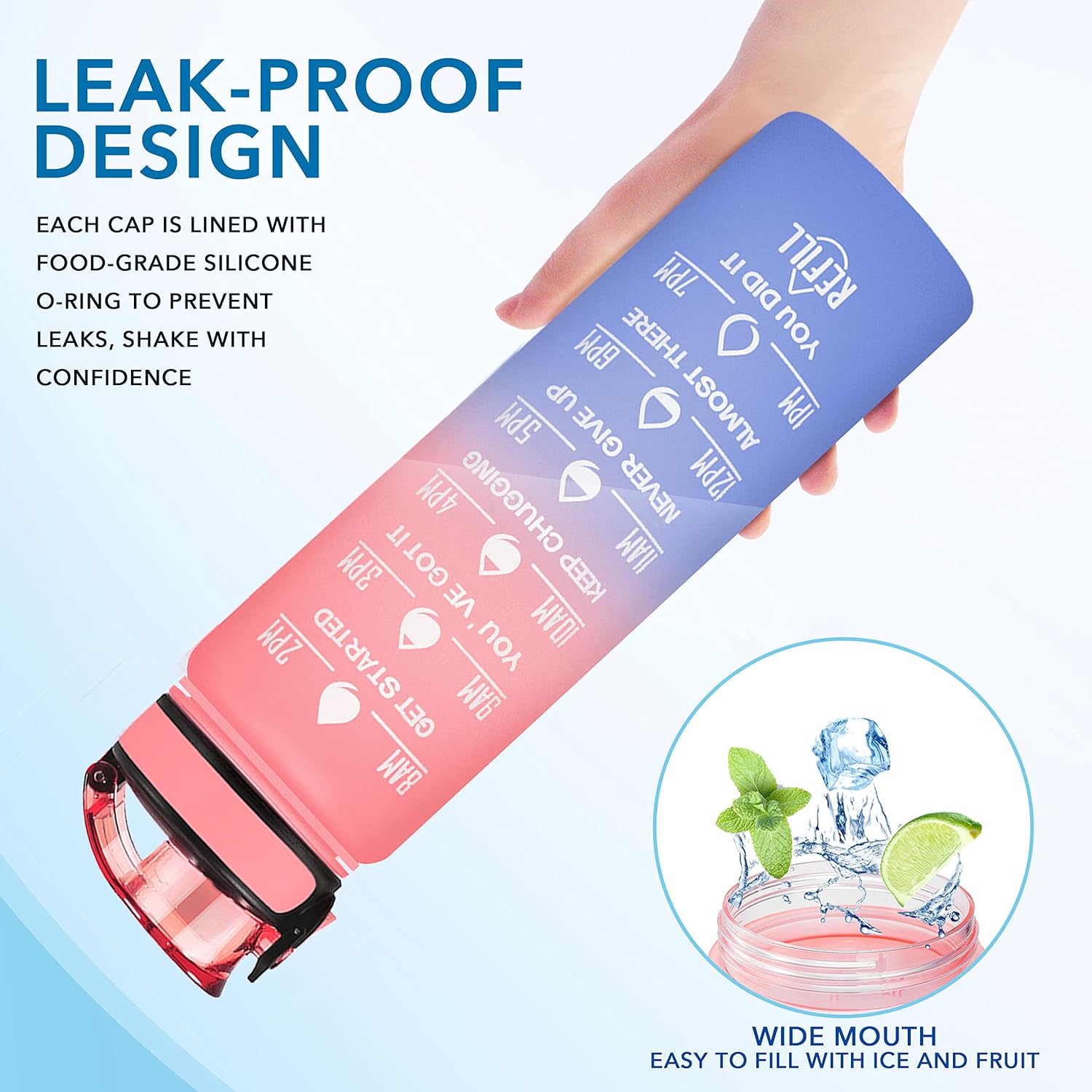 【Humanized Design】Water bottles with times to drink can quick open with one hand. The flip-top lid is used a secure lock, making it dust-free and leak-proof. Time water bottle is portable, light, and easy to use.
