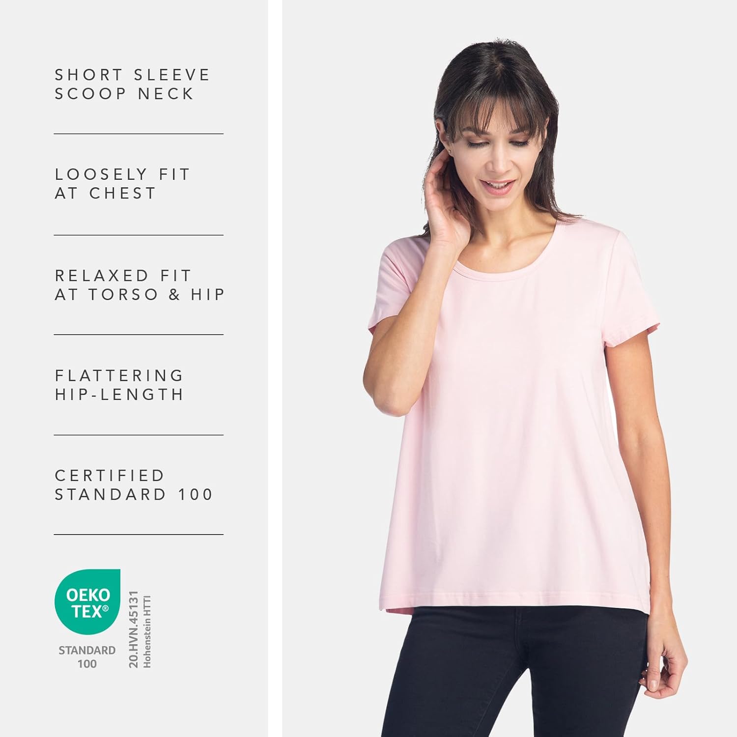 Super-soft and comfortable, this shirt is great for traveling! I took this (and three others of this brand) as my only shirts for a 15 day trip and they performed well. No wrinkles. Didn’t hold odor, even after a sweaty day. Easy to hand-wash in the sink or spot-wash (darn pasta sauces!) and dried overnight. The drape is very flattering without the shirt looking too loose, it falls low enough to be modest in front without being a tunic, and also looks good tucked in. All the comfort of a tshirt but much dressier. Have also machine-washed and dried using cold water & gentle cycle/ low heat tumble dry without damage or shrinkage.