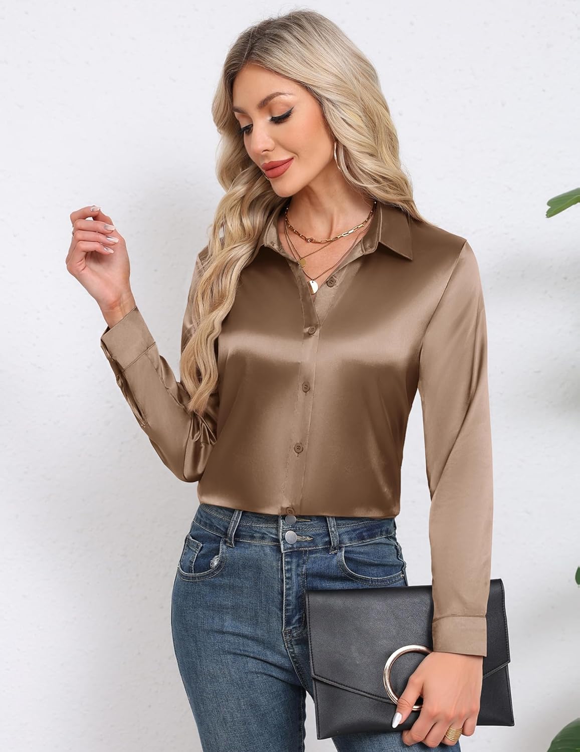 HOTOUCH Women’s Satin Silk Button Down Blouse Casual Loose Long Sleeve Work Tops