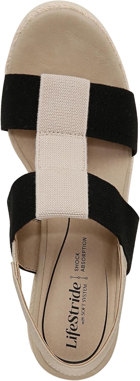 Look and feel your best every time you step out in these modern wedge espadrille sandals with superior cushioning. Designed with faux leather and stretch gore straps for extra flexibility, an open round toe, heel sling strap, and jute-wrapped espadrille wedge. Trusted Soft System® comfort technology for unmatched cushion, support, and flexibility in every pair. Shock absorption with pressure distribution and superior cushioning for an effortless feel. Traction sole for extra stability. Just Right Height 3 1/8 inch wedge heel.