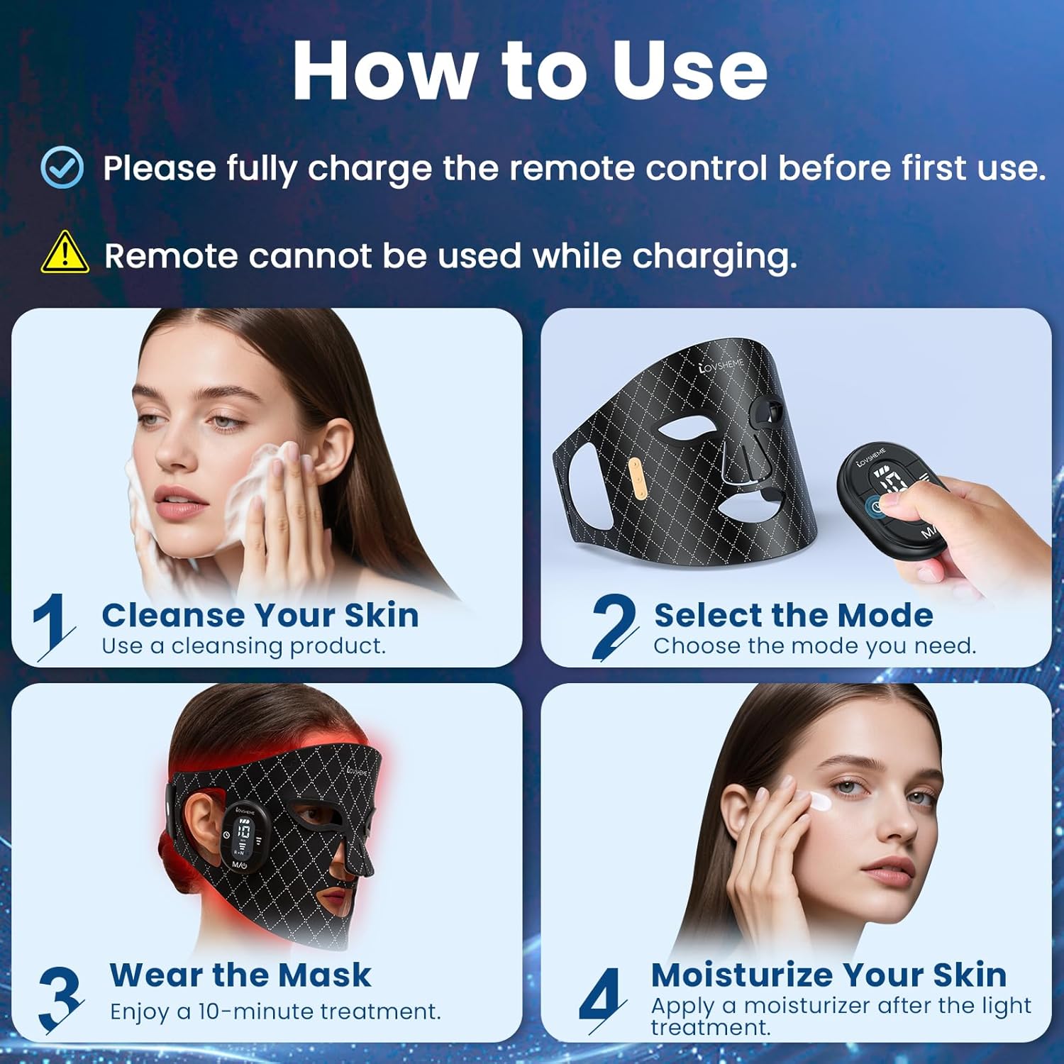 🌈【 3 LED Modes for Targeted Skincare】 Lovsheme red light therapy mask features Red + Blue (firming & glow), Blue (acne care), and Red + Infrared (deep revitalization)—clinically designed to address multiple skin concerns. For first-time use, start with low intensity and 10-minute sessions to help skin adapt.