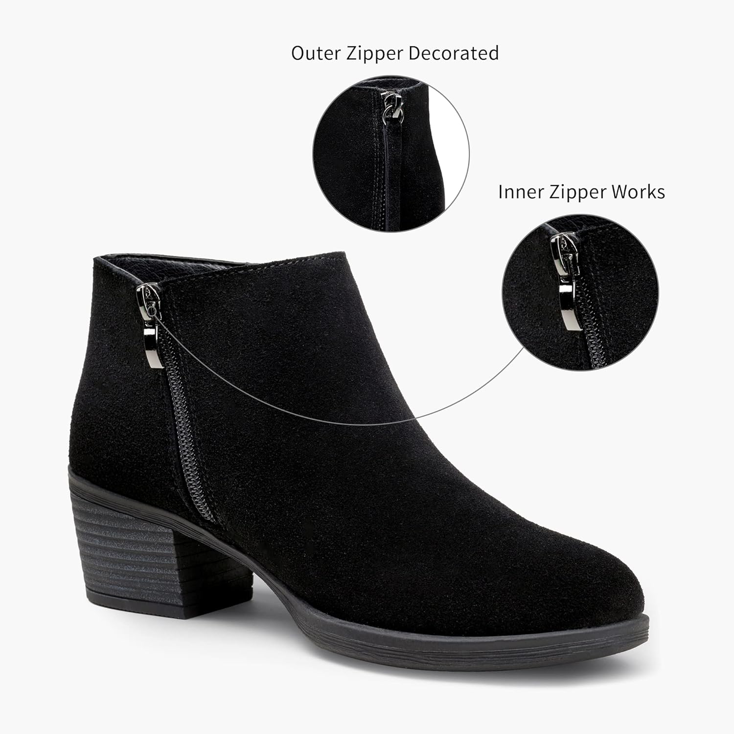 These low heel ankle boots are designed with inside zipper easy to put on and take off. Premium suede and TPR rubber soles make the shoes more durable, easy to clean. Soft Foam insole and excellent lining provide cushioning and breathable performance. Chunky low heel for smooth and comfortable wear. The round toe design of the ankle boots is not easy to rub your feet and enhance the wearing experience. Classic solid color design, easy to match with a variety of clothes, suitable for most daily activities.